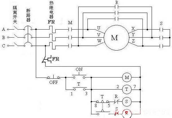 起動過程:合上隔離開關---合上斷路器----按下ON啟動按鈕---M,S,T得電---M接通主回路,S通過T的常閉觸點及R的常閉觸點得電---S主回路接通--正在做起動運轉過程。