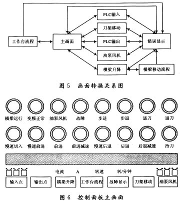 主畫面形象直觀地顯示龍門刨床工作臺的往復運動狀態(tài)、抬刀動作和與工作臺有關的限位開關的通斷狀態(tài)。用指示燈顯示工作臺的各種狀態(tài),例如前進、后退、慢速切入、前進減速和后退減速,以及工作臺步進和步退.。還用指示燈顯示油泵風機、變頻器的狀態(tài),以及進刀、退刀和故障信號等。畫面轉(zhuǎn)換關系和主畫面如圖5和圖6所示。